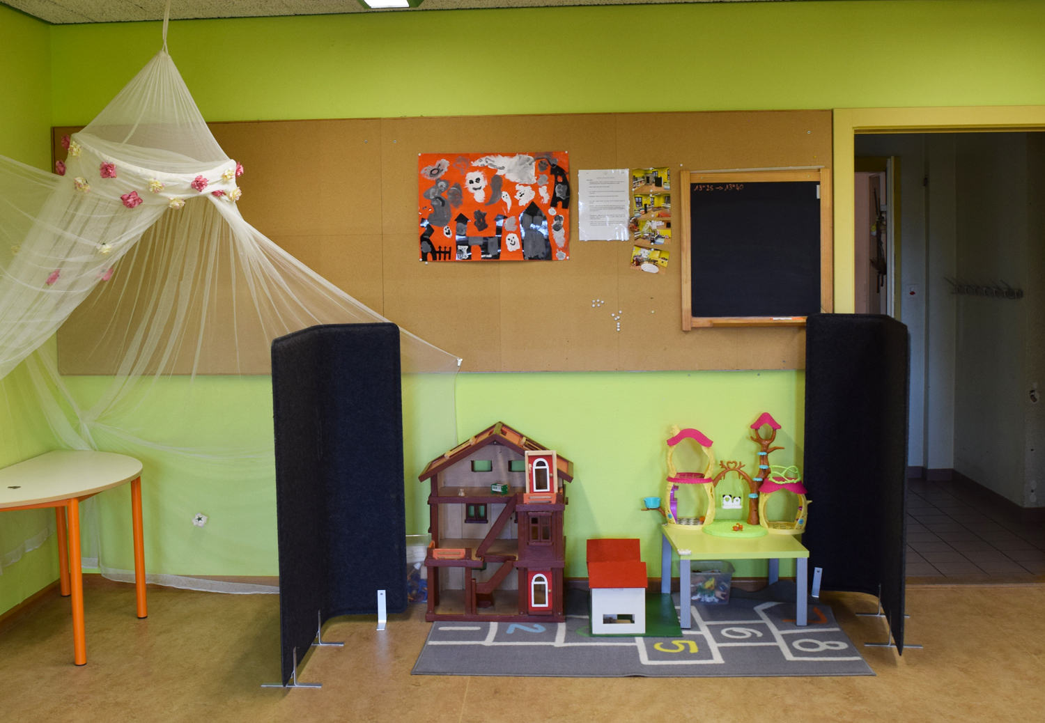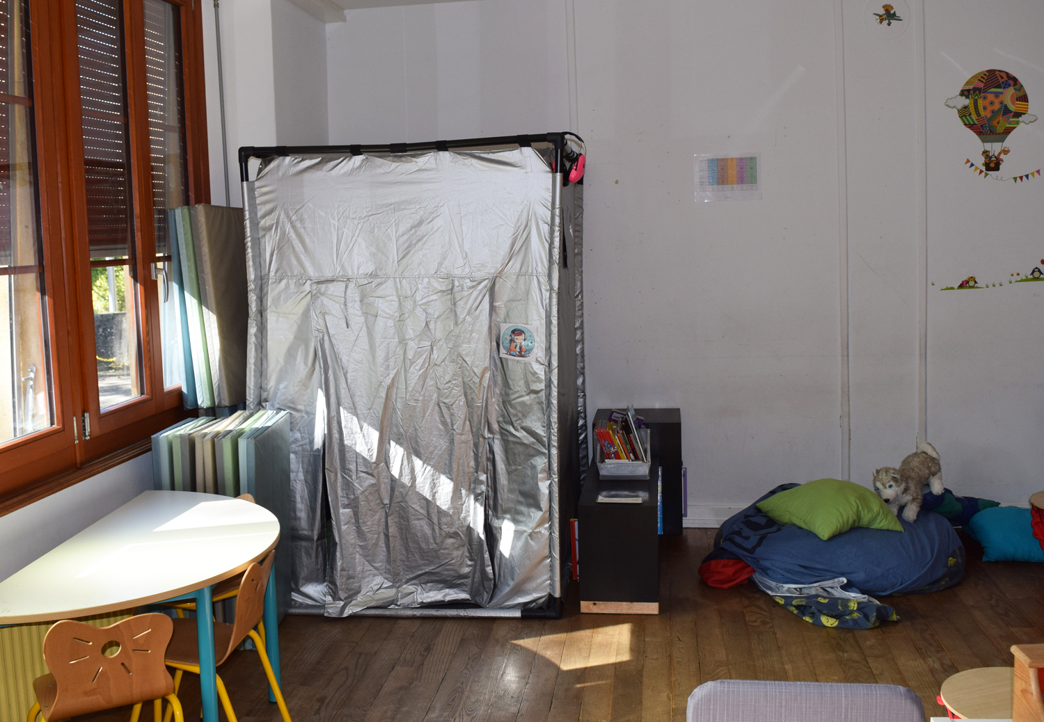 - En face, une salle dédiée au jeux symboliques avec un espace Snoezelen permettant aux enfants de bénéficier de moments de détente, de calme et de ressourcement dans un environnement apaisant.