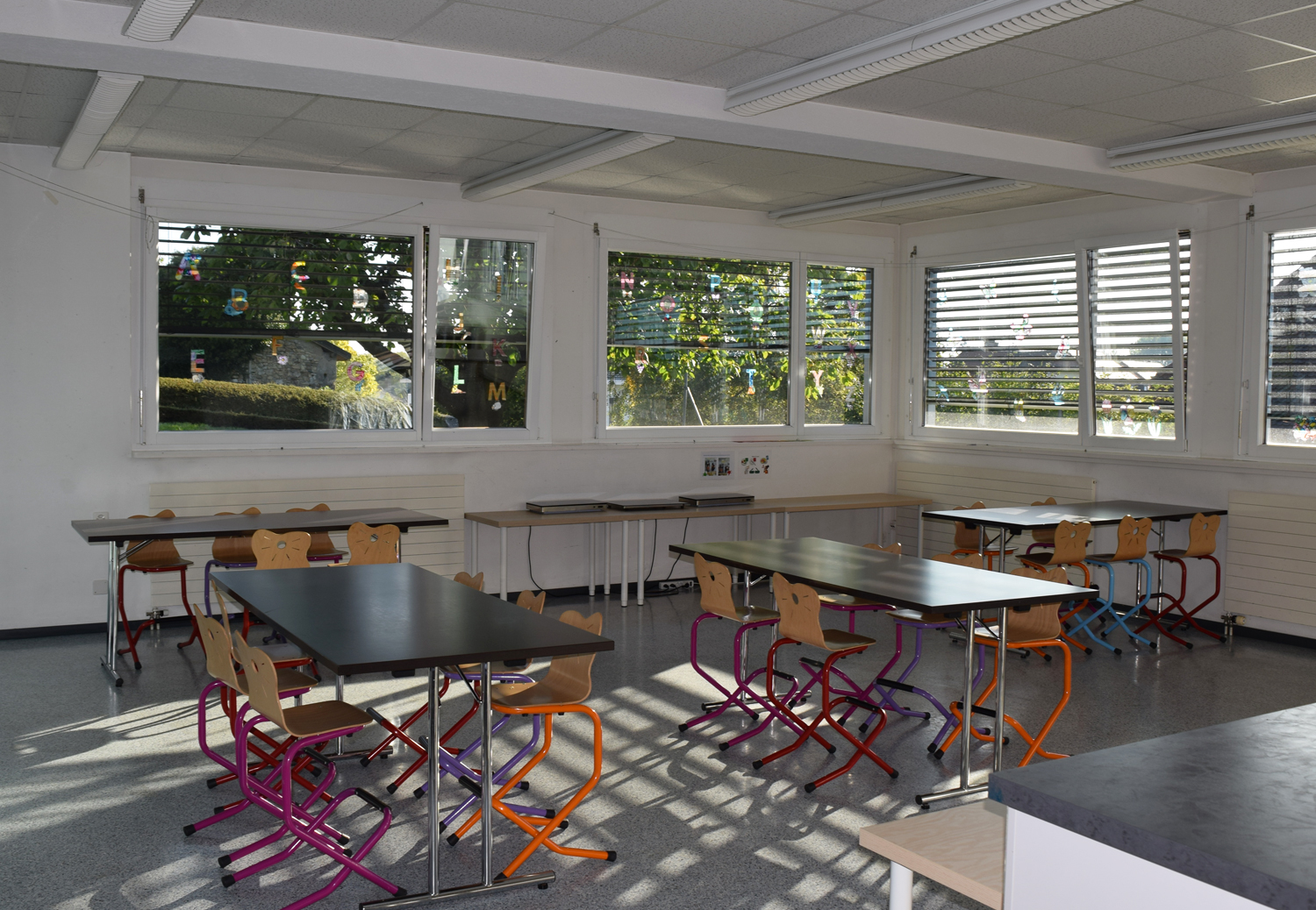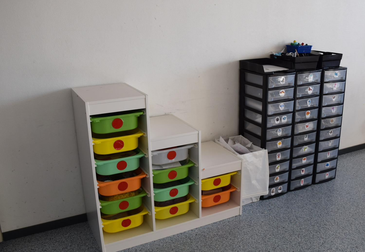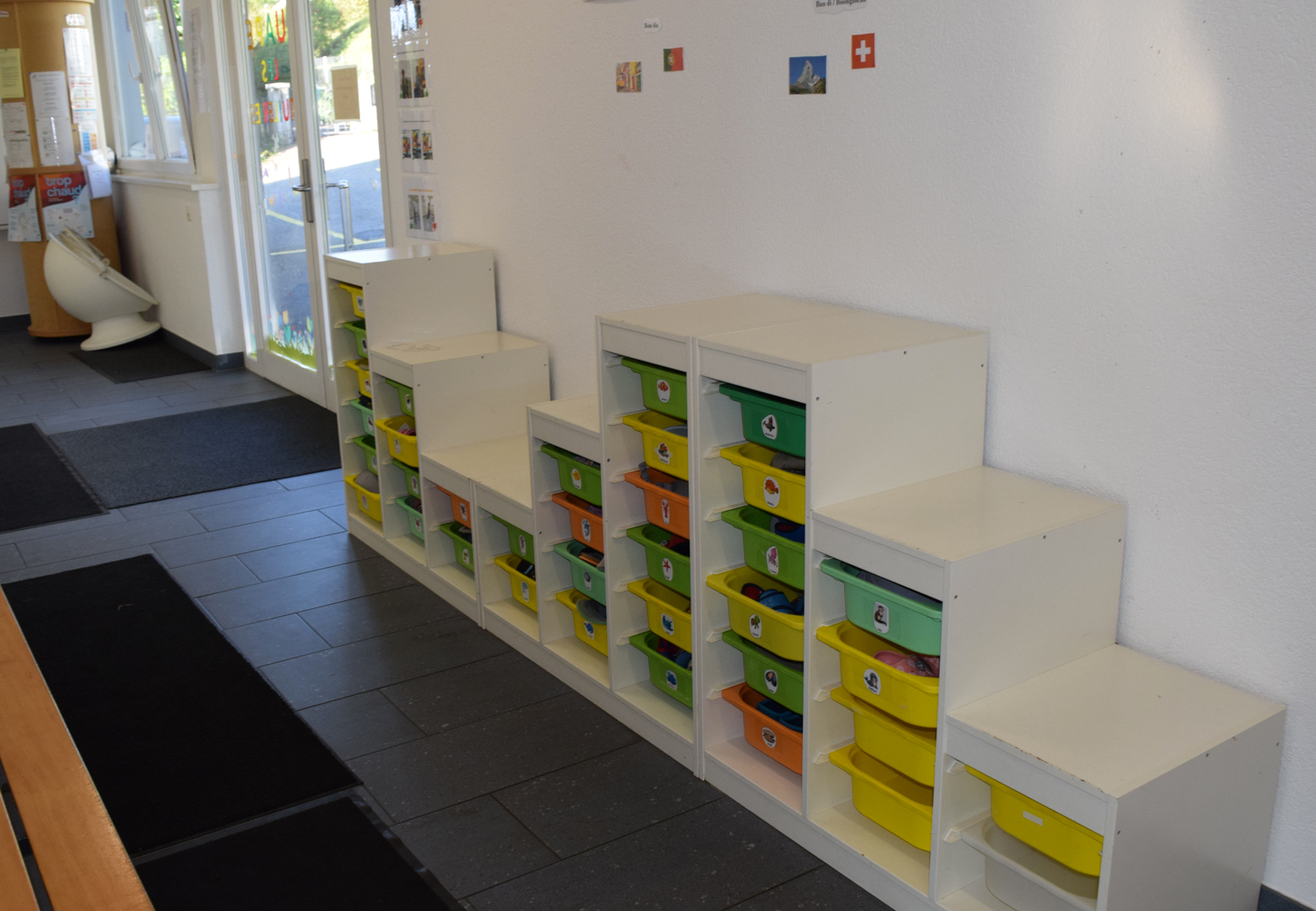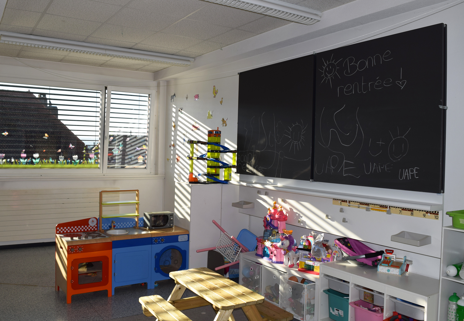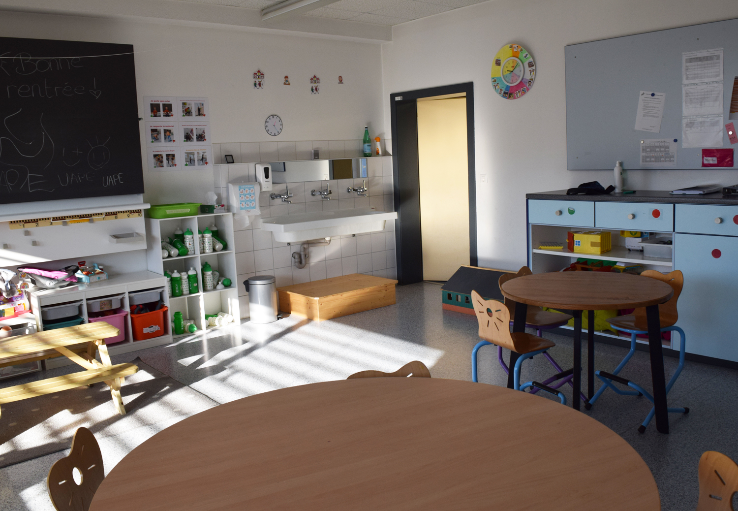 Une première salle est dédiée principalement aux repas de midi et aux goûters, grâce à son agencement elle permet de proposer des activités créatrices. Une seconde salle est aménagée pour les activités. Celle-ci propose différents espaces thématiques, tout en restant modulable afin de s’adapter aux besoins des enfants et aux projets du moment.